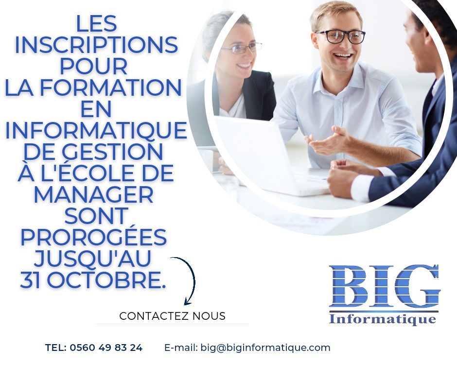 Les inscriptions pour la formation en informatique de gestion à l'école de manager sont prorogées jusqu'au 31 Octobre.